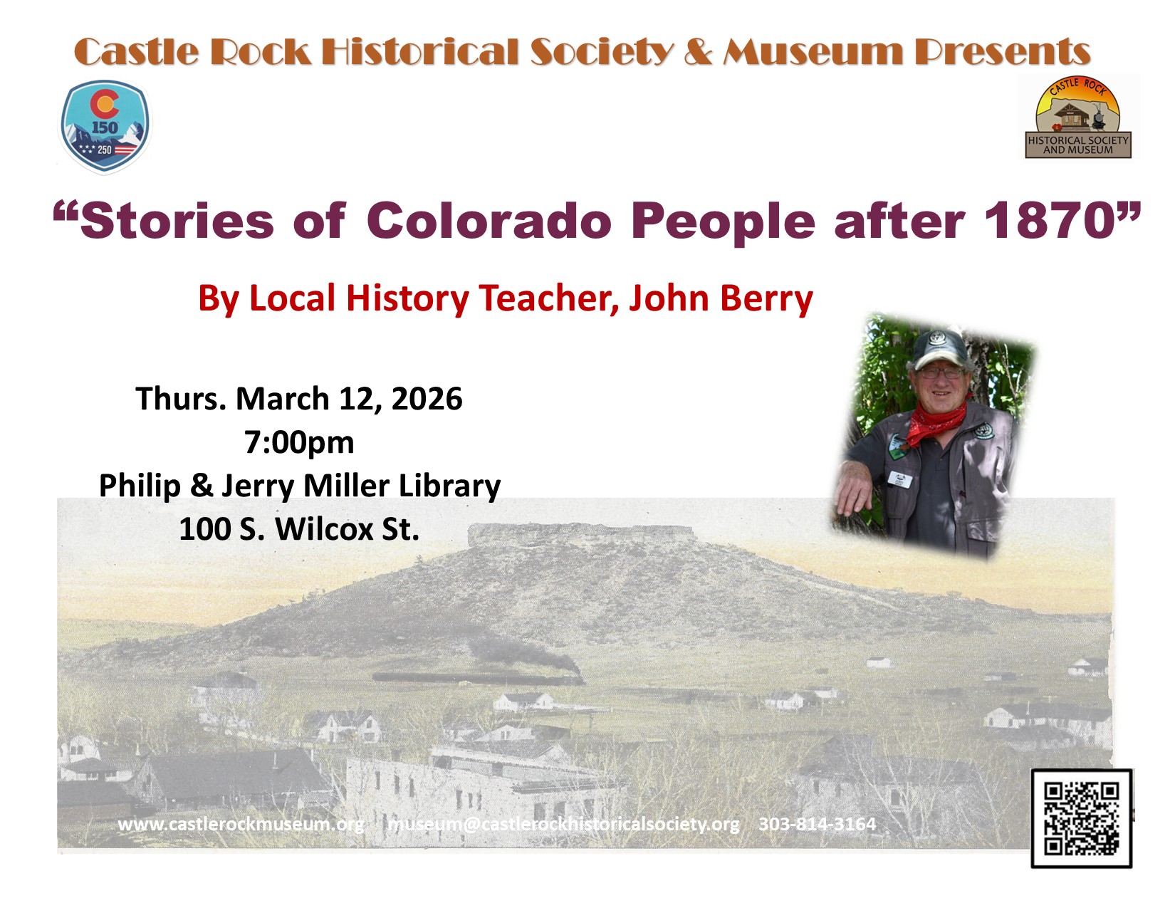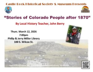 In honor of the 150/250 Celebrations taking place this year, on Thurs. March 12, 2026, retired local history teacher, John Berry will continue his series on the history Colorado after its statehood in 1876. Come hear stories about the important people in Colorado’s history after 1870. The presentation is at 7pm at the Philip & Jerry Miller Library 100 S. Wilcox St. Castle Rock, CO 80104. Contact the Castle Rock Museum for more information at museum@castlerockhistoricalsociety.org or 303-814-3164. Check out our website at www.castlerockmuseum.org for more events and information.